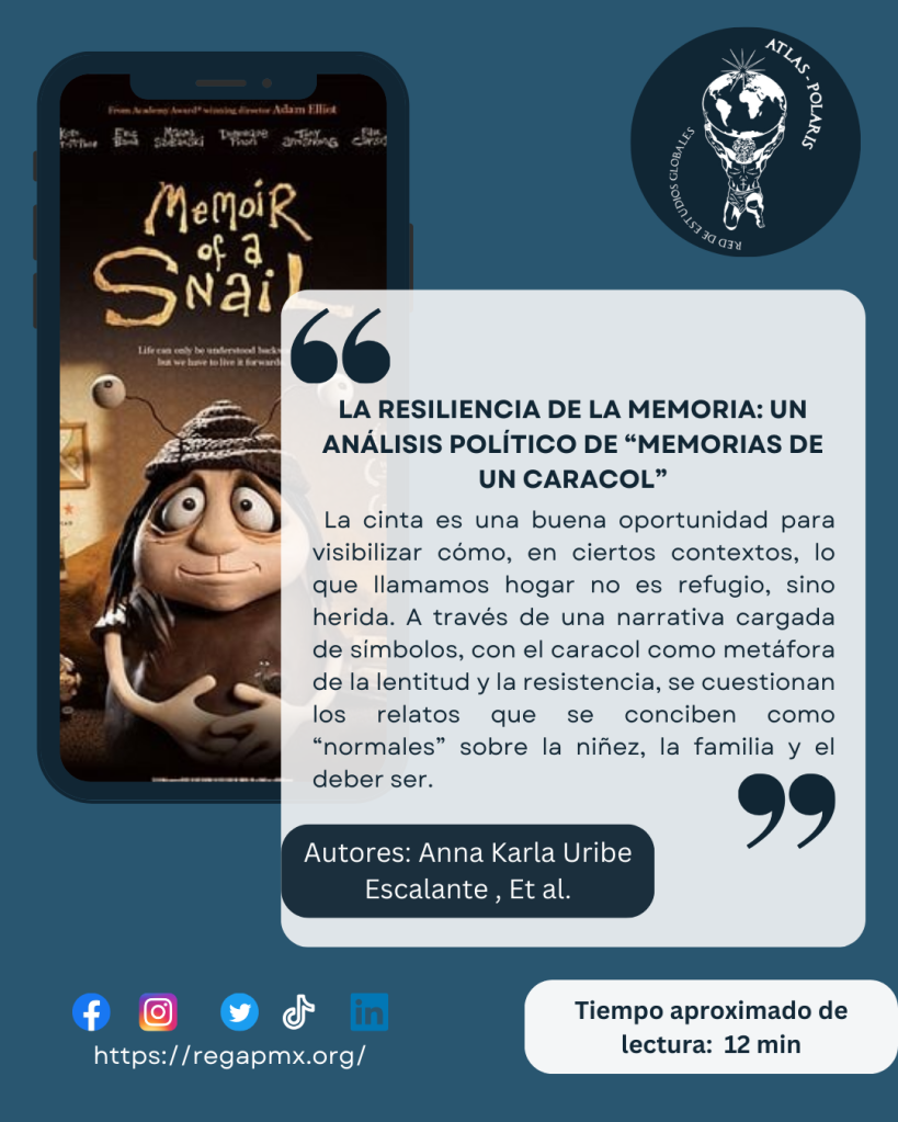 - Autores: Nava Sánchez, Helia Nayely. Uribe Escalante, Anna Karla (coords.). Cañedo Moctezuma, Adilene. Cruz Antonio, Teresa. De la Cruz Ordoñez, Miguel Armando. Díaz Cárdenas, Jimena Lucero. Enciso Raya, Ian German. Gómez Patiño, Antonio de Jesús. Ibarra Vega, Emiliano Moctezuma. Jaloma Osorio, Daniela. Landa Murga, Alessandra Paola. Magallán Ramón, Ximena Leonor. Mendoza Martínez, Scarlett Claudette. Montes de Oca Hernández, Arlette. Mosqueda de la Peña, Fabian. Ramírez García, Josúe. Solano Rangel, José Roberto. Suárez Castillo, Eder Israel. Valdivia Castañeda, Jimena. Vázquez Carrillo, Santiago (2025). La resiliencia de la memoria: Un análisis político de “Memorias de un caracol”. Trabajo inédito, Taller de Diseño de Investigación de Ciencias Políticas y Administración Pública. Estado de México: Facultad de Estudios Superiores Acatlán. ↩︎