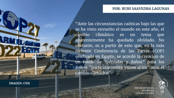 Columna escrita por Rubi Saavedra Lagunas Ante las circunstancias caóticas bajo las que se ha visto envuelto el mundo en este año, el cambio climático es un tema que aparentemente ha quedado olvidado. No obstante, es a partir de esto que, en la más reciente Conferencia de las Partes (COP) celebrada en Egipto, se acordó... Leer más →